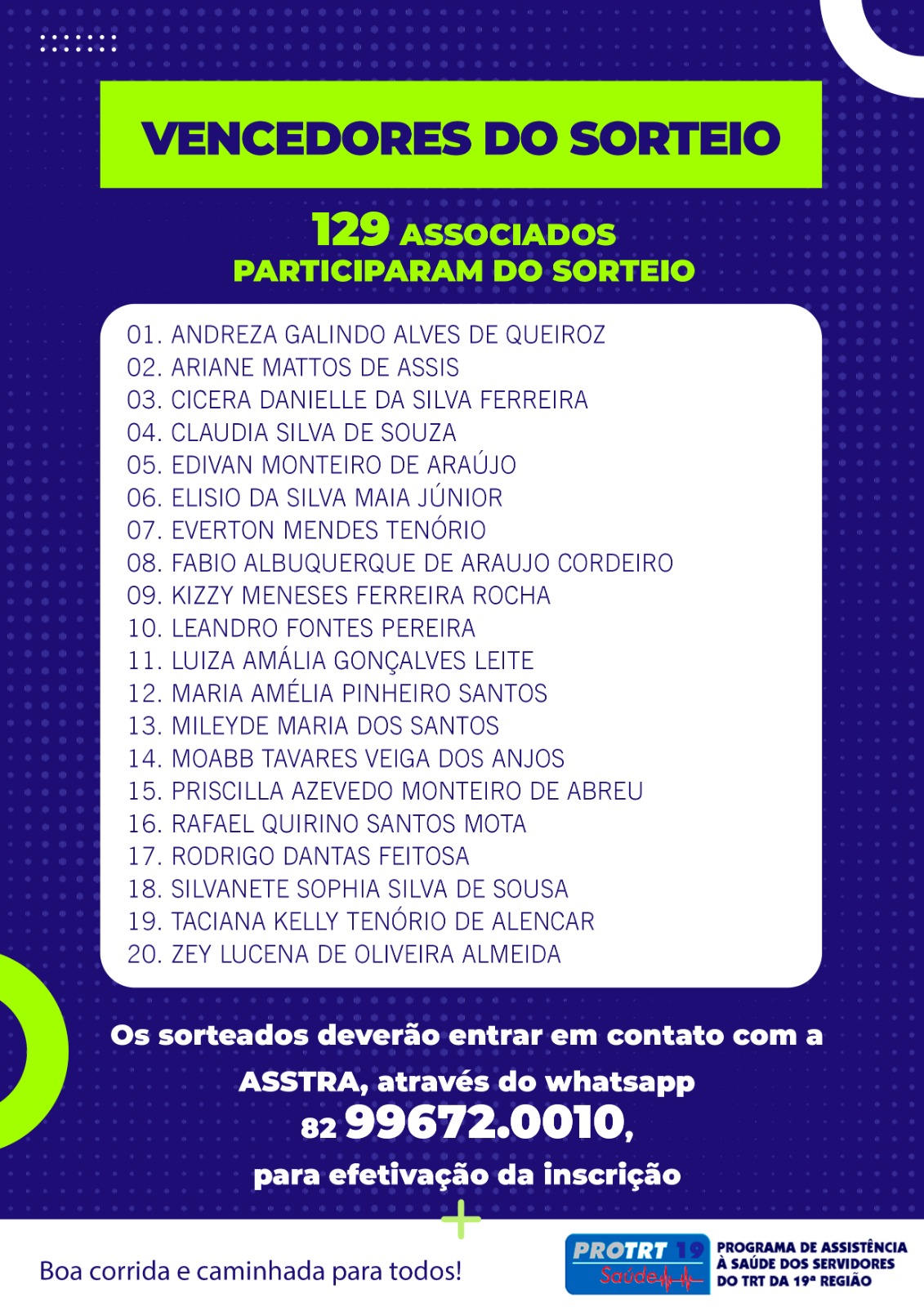 Os sorteados deverão entrar em contato com a ASSTRA, através do whatsapp 82 99672.0010, para efetivação da inscrição, com as seguintes informações: